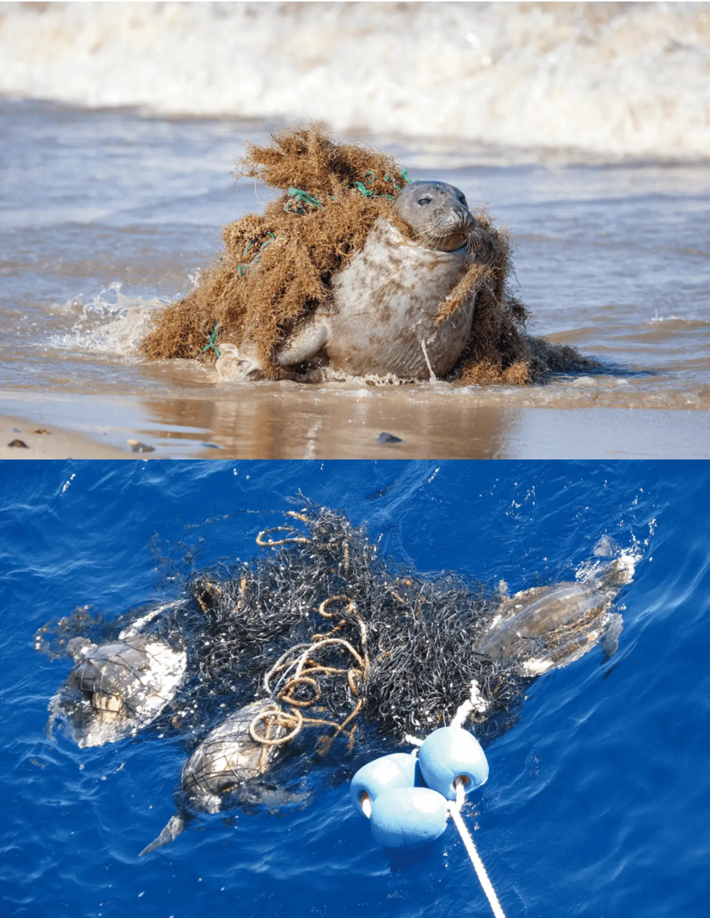 張卉君提到,這些廢棄漁具不僅會漂浮在海水表面,也有非常多依然存在於海洋底下持續地成為捕撈現象,但這些被困住的漁獲人類吃不到,當然也無法換算成更高的生產力,例如台灣常見的家計型沿近岸捕撈漁網「刺網」,容易造成生態的混獲跟纏繞,如果這些漁網遭到廢棄掉入海裡,因為看不清楚,海洋生物還是會持續地中網,所以被稱為「鬼網」;不同的船隻及漁法也會對海洋生物造成影響,像是比較遠洋會使用的「拖網」「延繩釣」等,雖然漁民並非有意要撈捕海龜,但許多海洋生物卻會一併被打撈上岸;另外,有時若太多廢棄物覆蓋在珊瑚礁周邊,等浪來或大潮時,可能會對珊瑚礁產生帶動和拉扯而造成傷害。