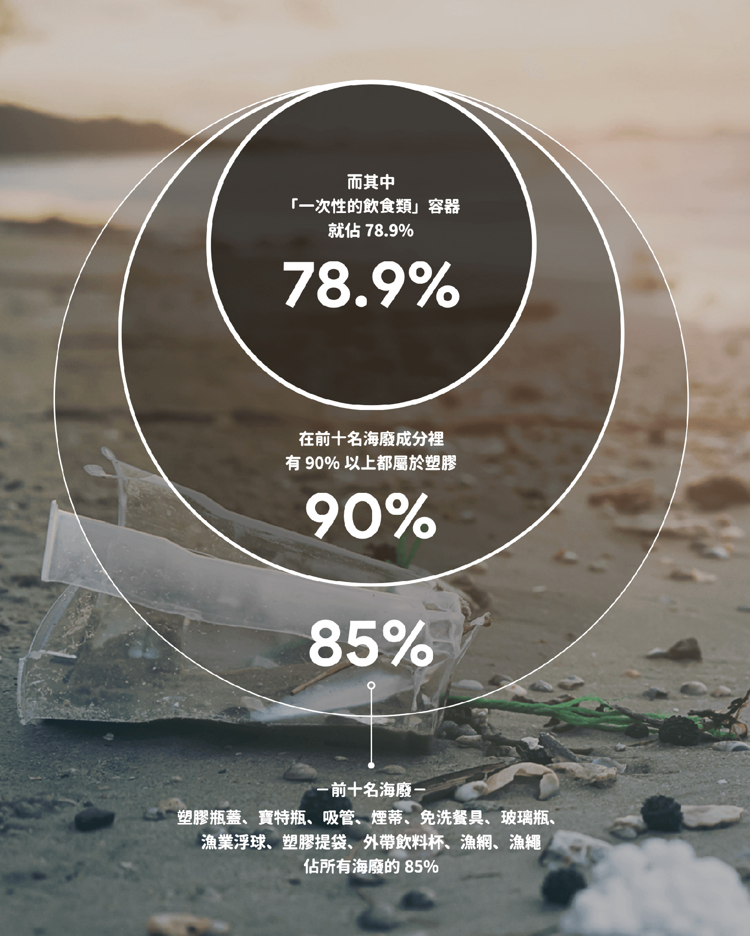 2021年的淨灘行動統計發現的廢棄物,前十名海廢(包含塑膠瓶蓋、寶特瓶、吸管、煙蒂、免洗餐具、玻璃瓶、漁業浮球、塑膠提袋、外帶飲料杯、漁網及漁繩)就佔了所有海廢的85%。換句話說,如果重點管理這十樣東西,就能有效減少85%的海廢。她說,分析前十名海廢成分後發現,有90%以上都屬於塑膠,進一步做海洋廢棄物組成分析,「一次性的飲食類」就佔78.9%,「這就是為什麼現在有很多的限塑政策,是針對在瓶子、塑膠袋這些一次性包裝的原因,這也就是經過紀錄調查分析後,進而影響政策的結果。」
