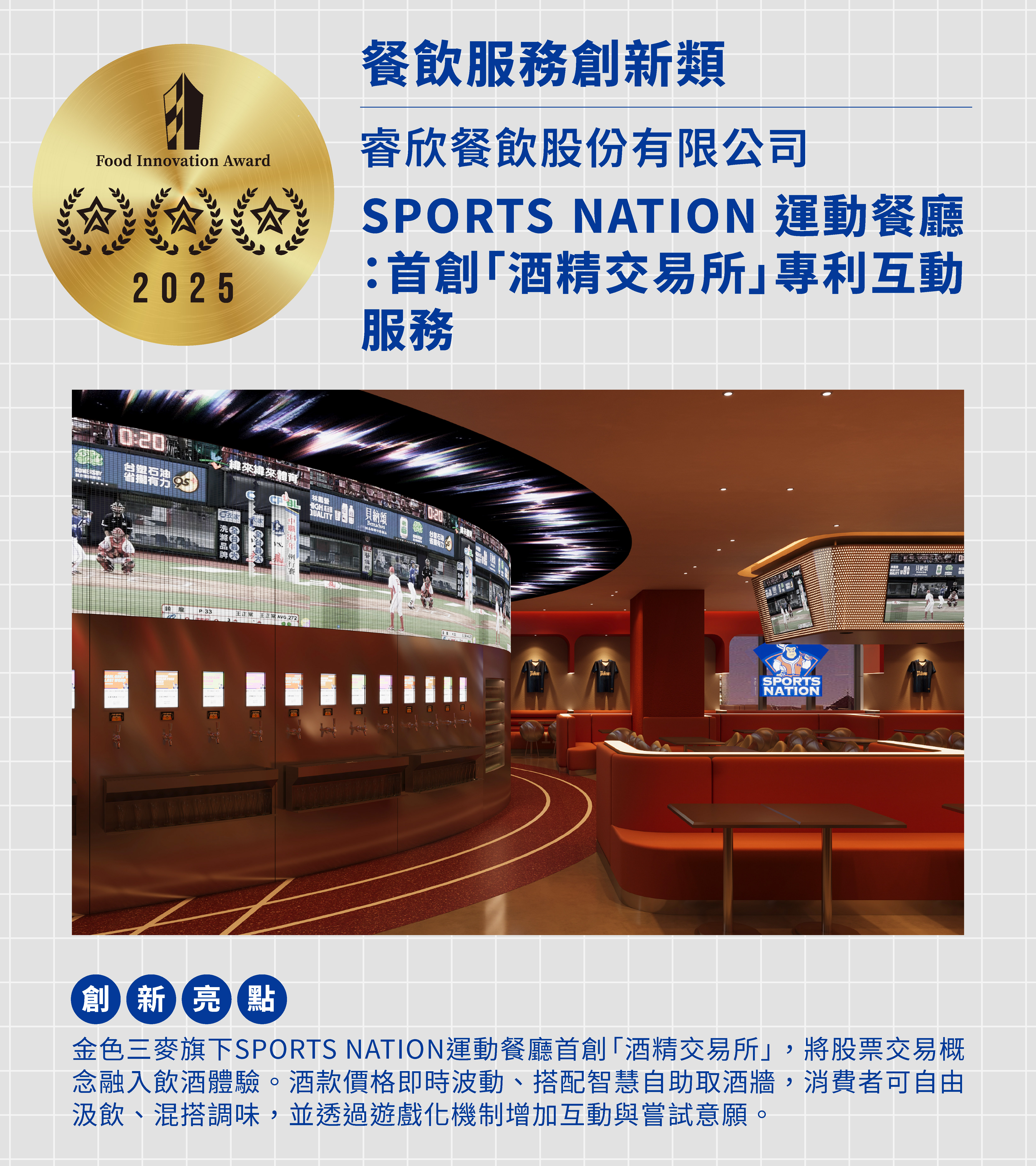 引爆2025年餐飲服務話題、金色三麥餐飲集團「SPORTS NATION 運動餐廳:首創『酒精交易所』專利互動服務」,將股票交易概念導入餐廳。酒款價格依取酒量即時波動,每30分鐘更新並顯示於環狀螢幕,已取得台灣設計專利的認證,搭配百萬級智慧自助取酒牆,消費者持儲值酒卡自由汲飲,以量計價,不僅可小量試飲也可自由混搭調出個人風味。