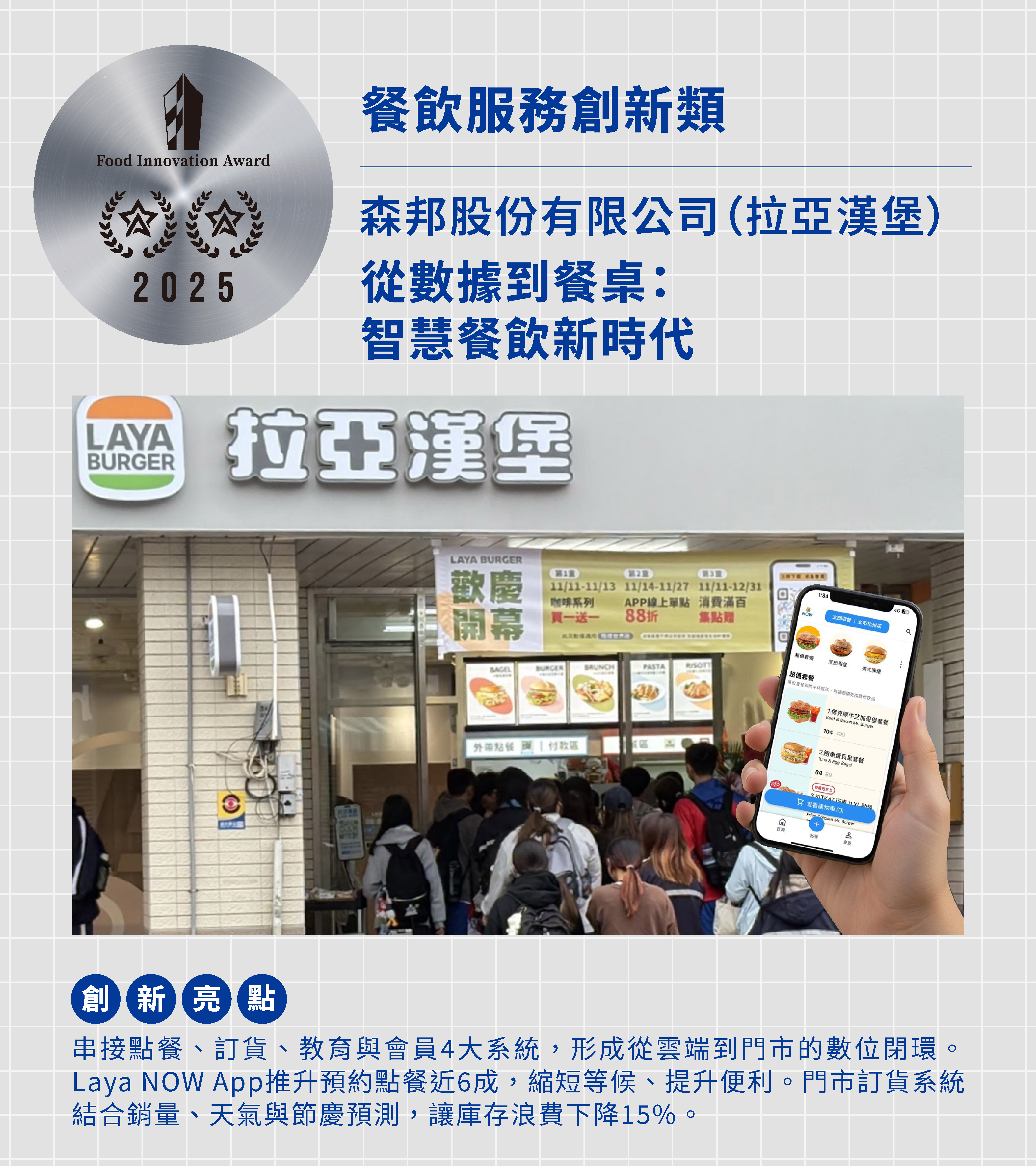 大成集團達能資訊「AI 門市管理大師」與森邦股份有限公司(拉亞漢堡)「從數據到餐桌:智慧餐飲新時代」,皆是投入AI 應用,提供創新服務,雙雙獲得二星肯定。