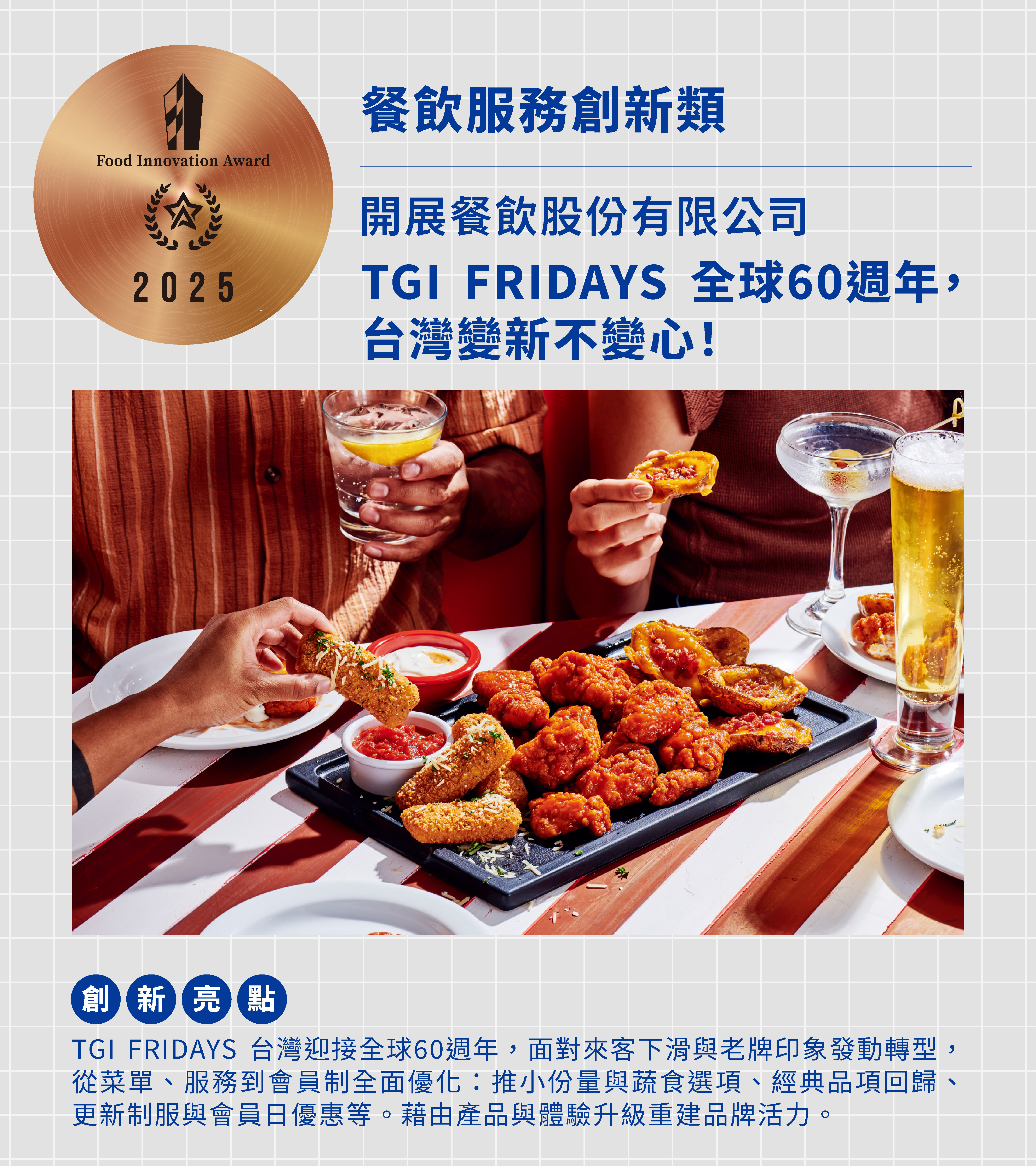 本屆餐飲服務創新類別,有三個方案獲得一星肯定,其中二個方案比較偏向餐飲行銷性質。開展餐飲「TGI FRIDAYS 全球60週年,台灣變新不變心!」,隨著時代不斷變遷,台灣餐飲市場選擇愈來愈多元,導致來客量下降,甚至是「老品牌」的印象,因應全球60週年,台灣 TGI FRIDAYS 決心藉此機會積極突破與轉變。