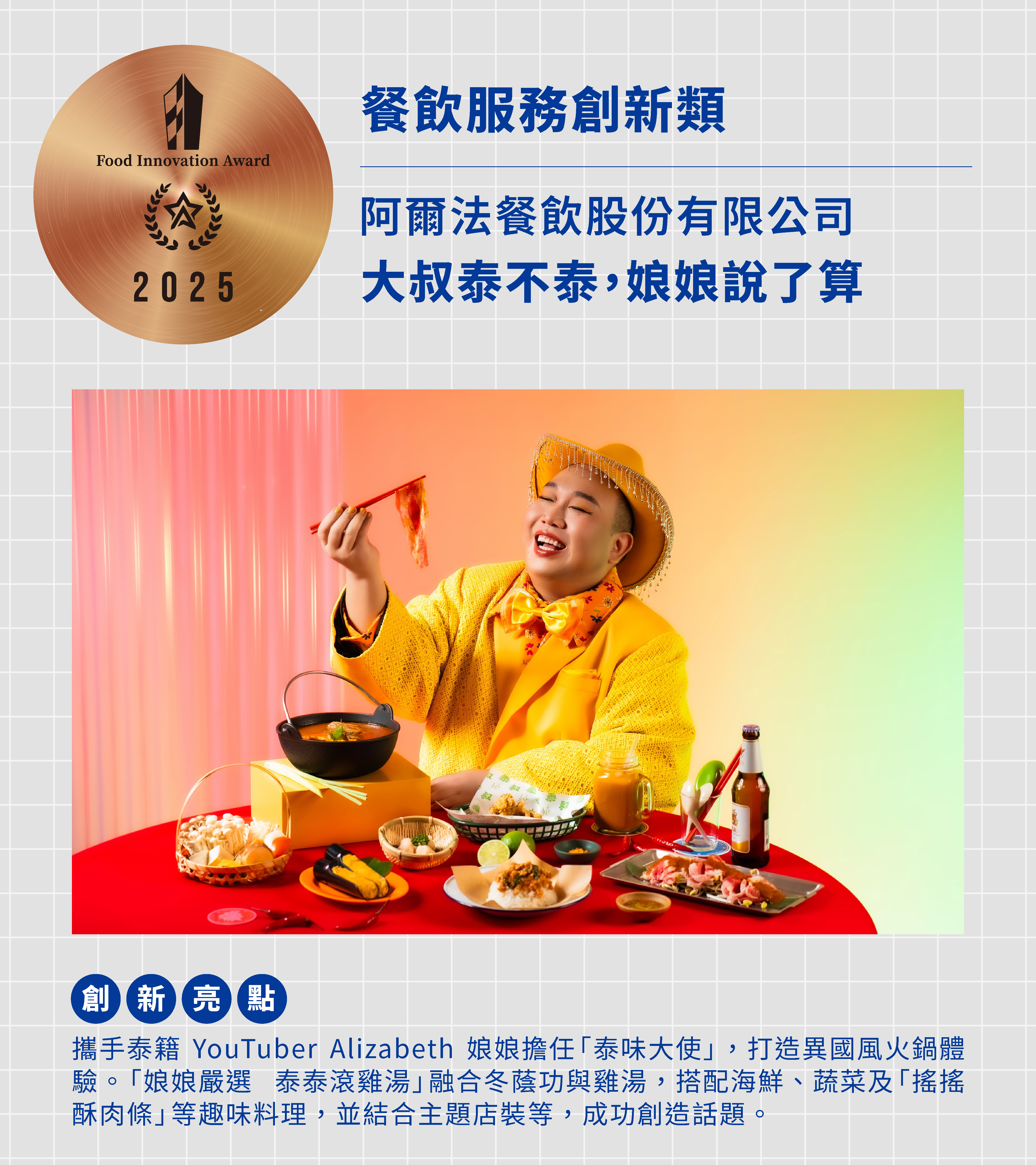 另一個是阿爾法餐飲「大叔泰不泰,娘娘說了算」,這個方案是連鎖火鍋品牌「雞湯大叔」與泰國網紅的跨界合作,以季度限定和IP聯名的創新模式,攜手泰籍人氣YouTuber Alizabeth娘娘,擔任泰味大使,強化品牌娛樂性與文化張力。同步選定兩家門市主題換裝,導入泰國街頭元素與音樂,提供消費者沉浸體驗,拉動年輕族群互動與回訪。