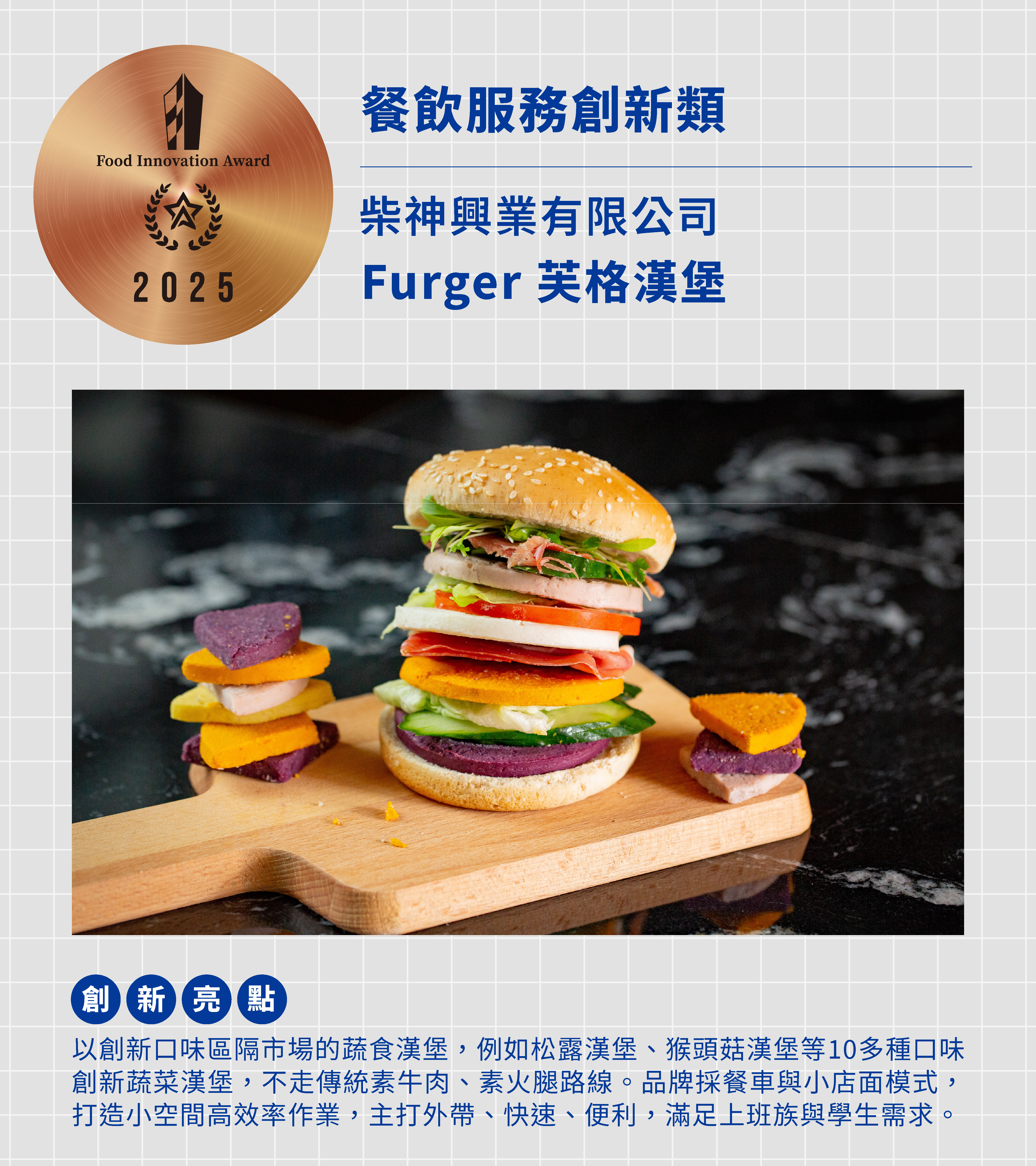 柴神興業以「Furger芙格漢堡」獲得一星。柴神興業成立至今25年,從事食品研發及製造已經20多年,從巧速餅系列有黃金地瓜、紫心地瓜、金讚南瓜等,素排有松露排、煙燻排、椒麻排、杏鮑菇排等,延伸到創立蔬食漢堡品牌Furger芙格漢堡,同時擁有工廠、生產技術、品牌門市,以及創新口味產品。