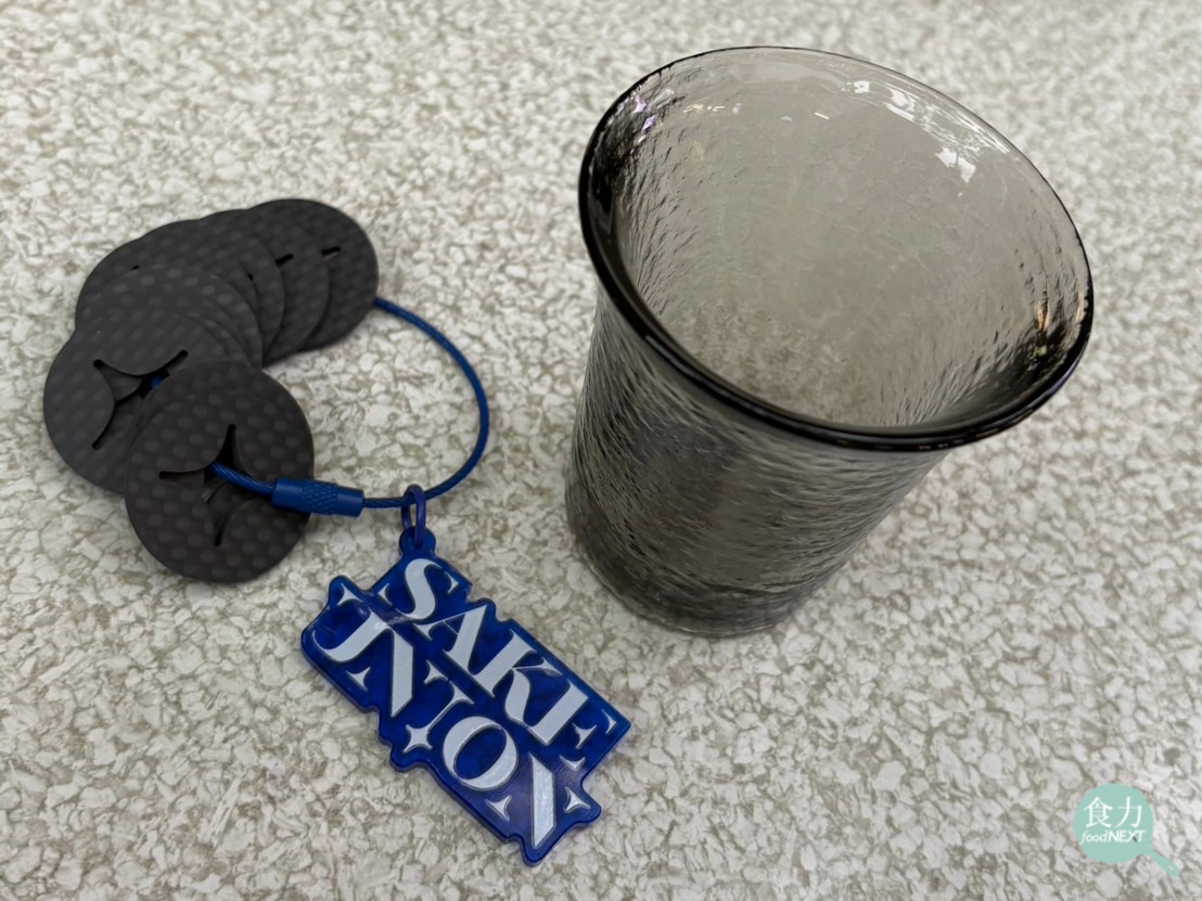 Sake Union攜手台灣春池玻璃,以回收玻璃精工打造極具質感的活動專屬品酒杯。使用航太級碳纖維餘料製作的活動代幣,可於現場兌換清酒與料理。(劉力菁攝)
