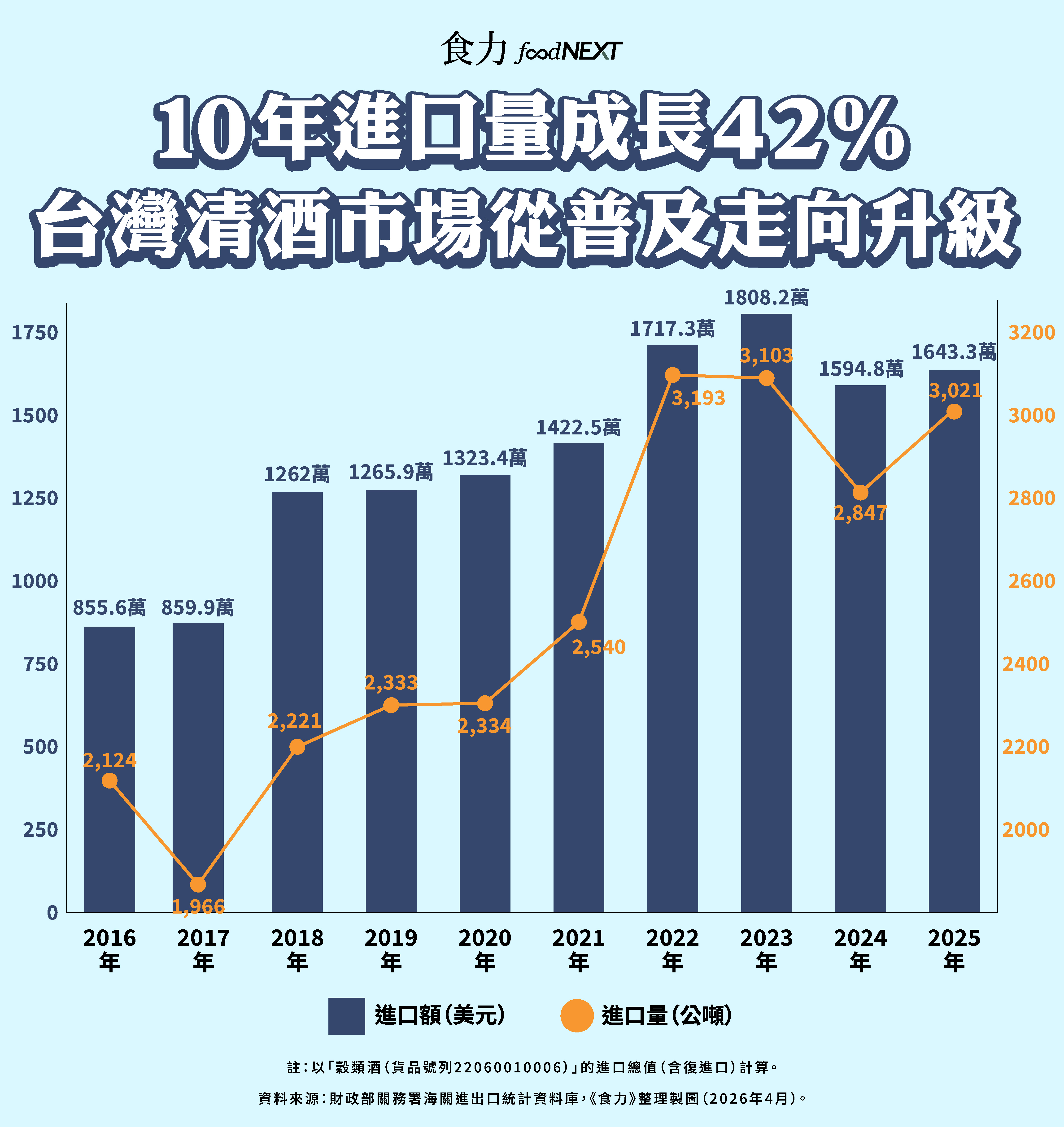 從台灣進口端來看,這樣的結構變化具有長期基礎。根據財政部關務署統計,2016年台灣自日本進口清酒2,124公噸,至2025年提升至3,021公噸,10年間成長約42.2%,清酒進口量呈現穩定上升,顯示其需求已逐步滲透至常態消費結構。