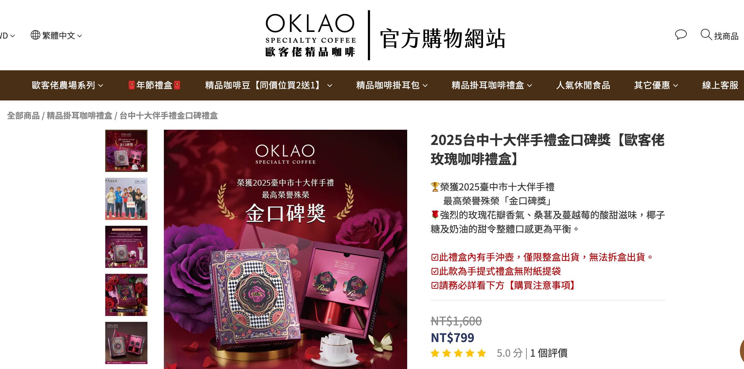歐客佬玫瑰咖啡禮盒榮獲2025臺中市十大伴手禮,12月19日主辦單位台中市工商策進會決議撤銷得獎資格,且3年內不得再參選。(圖片來源:歐客佬官方購物網站截圖)