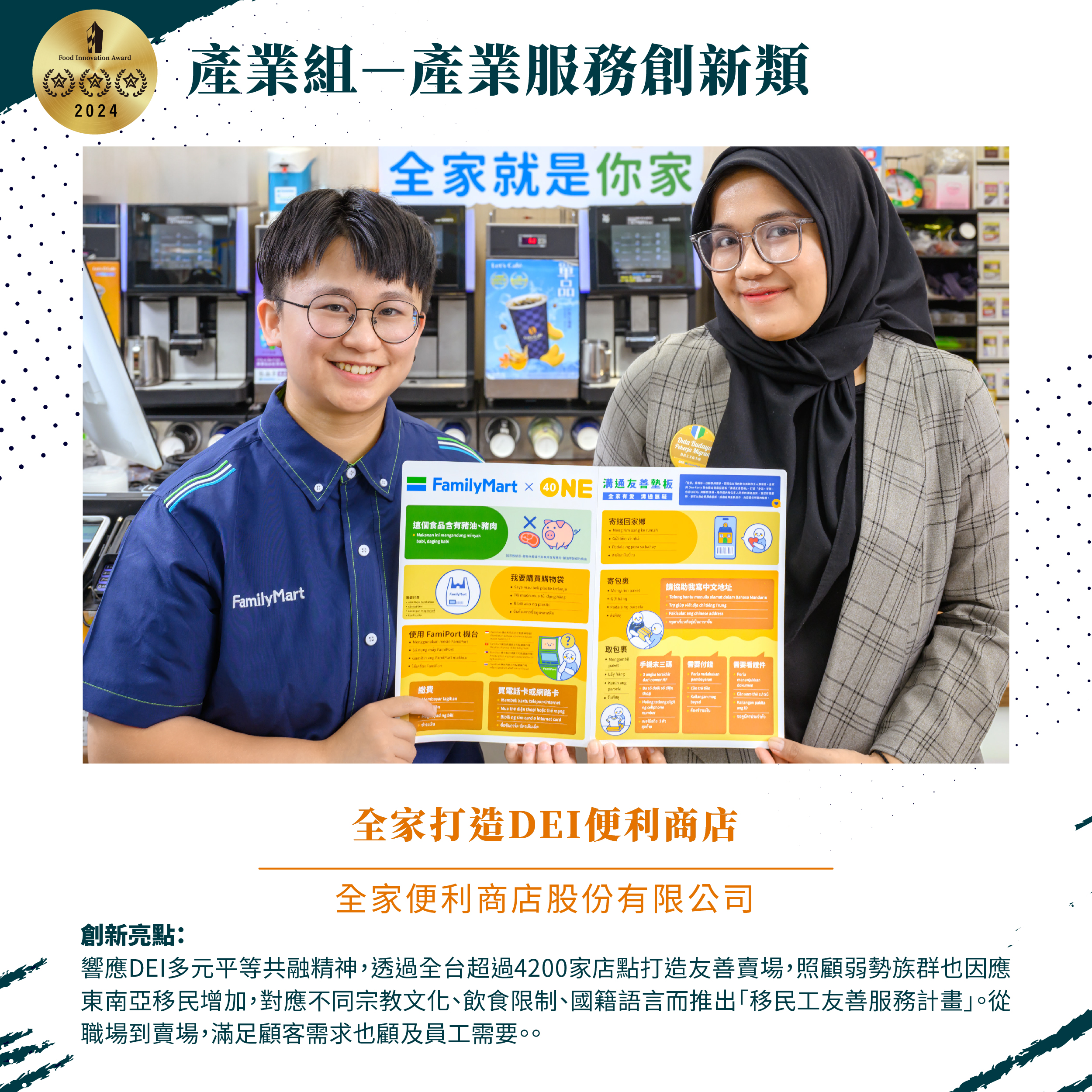 此次奪得產業服務創新三星肯定的「全家打造DEI便利商店」方案,以照顧弱勢群體出發,提供身心障礙者、移工就業機會。全家與勝利基金會合作開設全台唯一多元、平等與包容的「DEI便利商店」,由不同障礙別的身心障礙夥伴共同組合成不同專長的店員,創建業界認為不可能的經營模式,在超商產業上有所突破;也與非營利組織One-Forty合作,打造多語系、多商品、多交流的移工友善店舖,門市遍及全台,針對住宅區、工業區導入「東南亞商品專區」讓移工們在台灣也有回到家鄉的歸屬感。