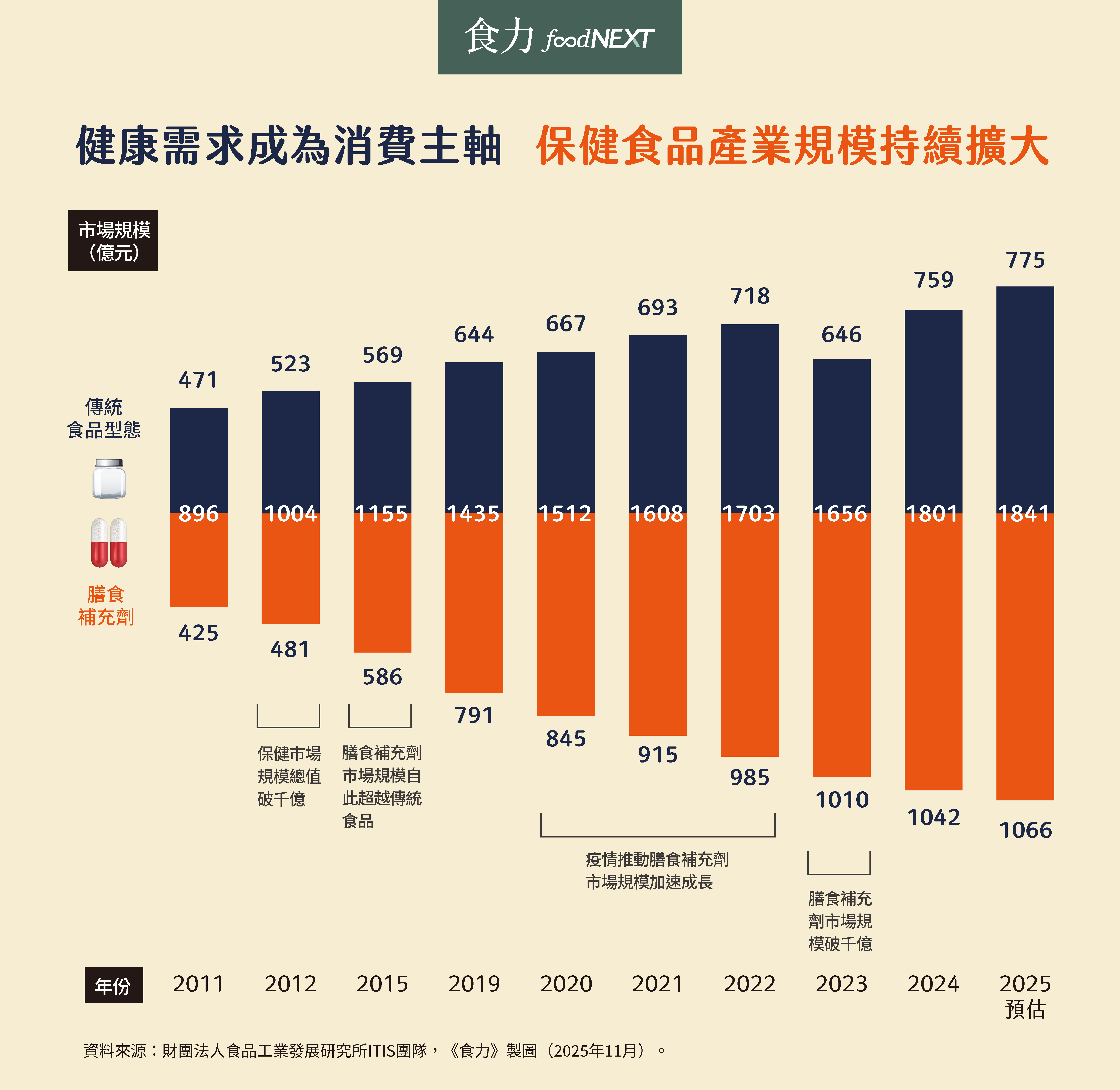 從全球趨勢再聚焦到台灣的健康產業發展,財團法人食品工業發展研究所(簡稱食品所)ITIS團隊估算整體保健食品產業鏈的產值,包含「添加機能素材的傳統食品」和「錠劑膠囊類的膳食補充劑」的市場變化,可見從2012年起保健市場規模就已破千億,而膳食補充劑市場規模自2015年起就超越傳統食品,2023年起規模持續成長到破千億,預估2025年可達1066億元。