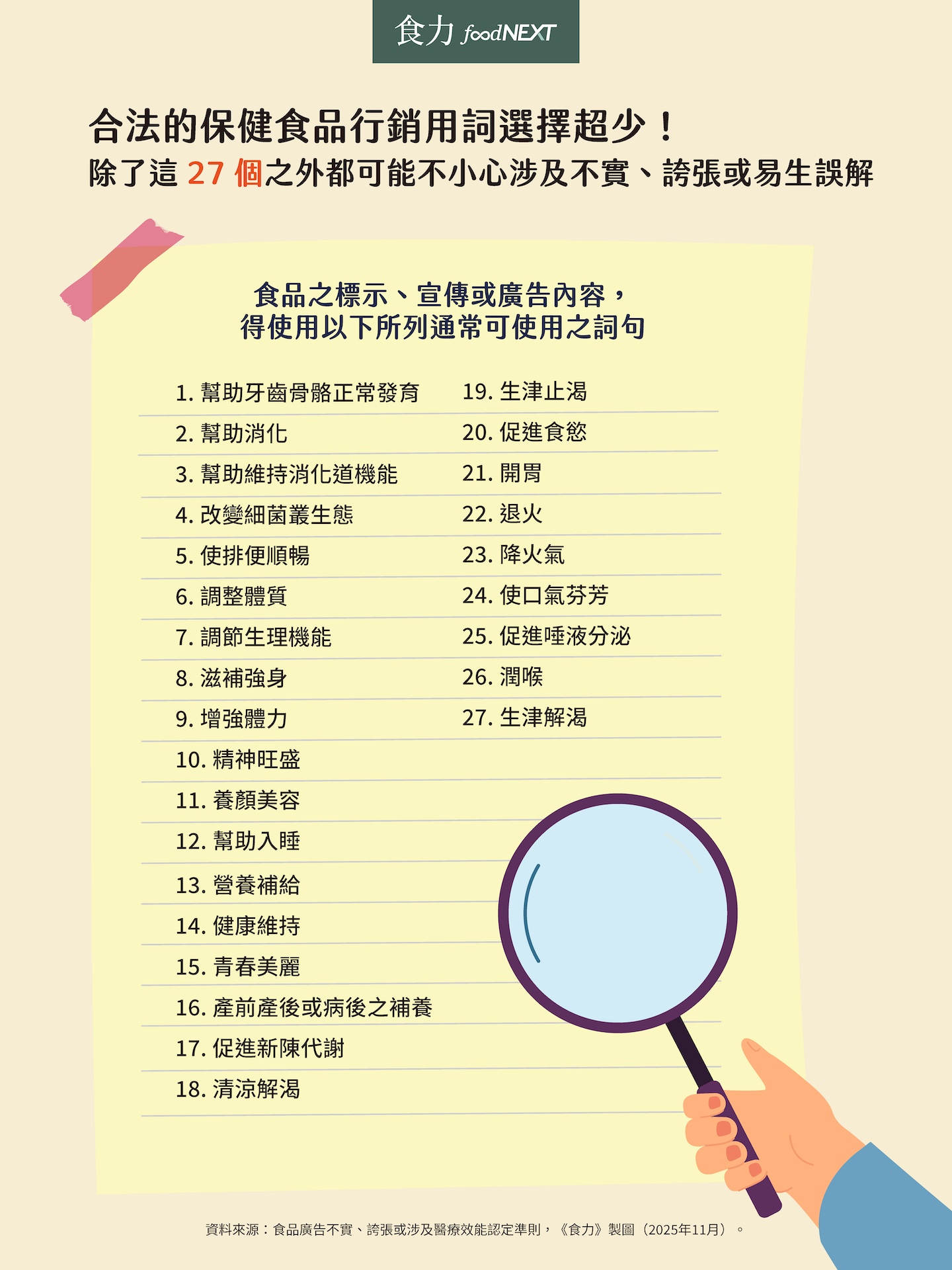 問題在於,這十多年間,僅進行零星措辭修補,並未擴大功能分類,語詞清單幾乎沒有更新,也未重新建構廣告用詞與科學證據之間的連結,除了營養素或特定成分之生理功能詞句,目前能合法使用的字彙仍僅有27個字詞,且分類邏輯尚停留在早期健康概念