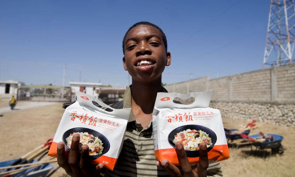 香積飯因為是純素成分,也方便運送到海外賑災。最大眾化的口味為蔬菜、玉米、咖哩、海帶芽。國際賑災則會提供符合當地飲食習慣的口味,例如紅豆飯、義式番茄口味。(圖片來源:慈濟提供)