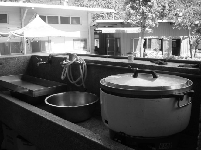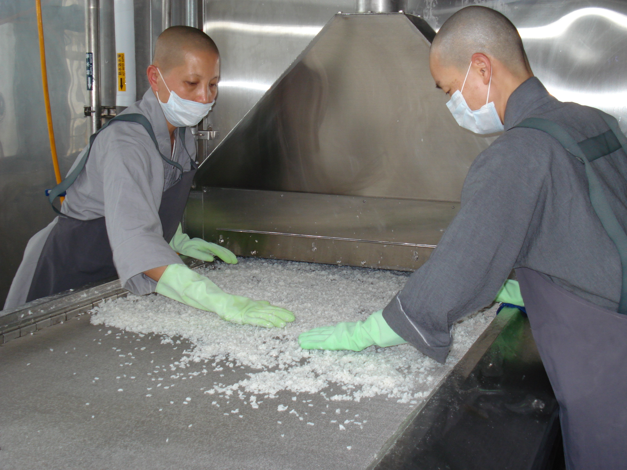 德晗師父(下圖左)早期研發香積飯是從自己煮飯開始摸索米飯乾燥與還原的原理,上圖為當時克難的「研發室」,2008年開始以全長約30米的隧道式乾燥設備量產。(圖片來源:慈濟提供)