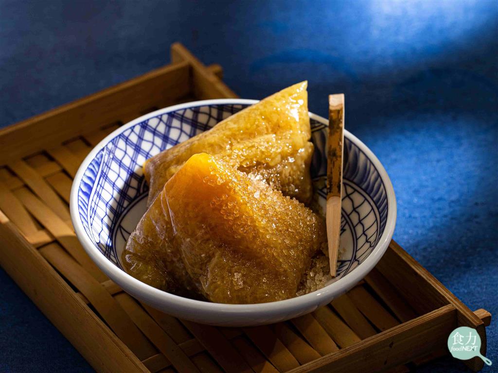 當糯米遇上鹼粉、鹼水這些鹼性物質後,糯米中的澱粉會產生「糊化作用」,造成澱粉顆粒原有的結構改變,並與水分子結合,使米粒中的澱粉膨潤,再經過燜煮步驟後,米形消失,鹼粽就化身為金黃軟Q的果凍狀。