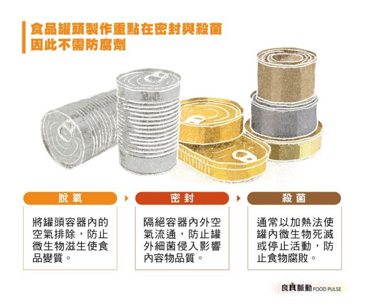 防腐劑(Preservatives)功能在於防止食品腐化變質,抑制微生物與細菌生長,延長保存期限,但罐頭類食品依法規定不可添加防腐劑。灃食智庫許庭禎副教授指出,一般消費者認為罐頭食物或泡麵中有防腐劑是常見迷思,所有台灣的食品罐頭製造必須符合國際製造標準,包括密閉容器、商業滅菌(俗稱高溫殺菌)與室溫保存三項原則,以杜絕微生物的生存條件,尤其是肉毒桿菌。