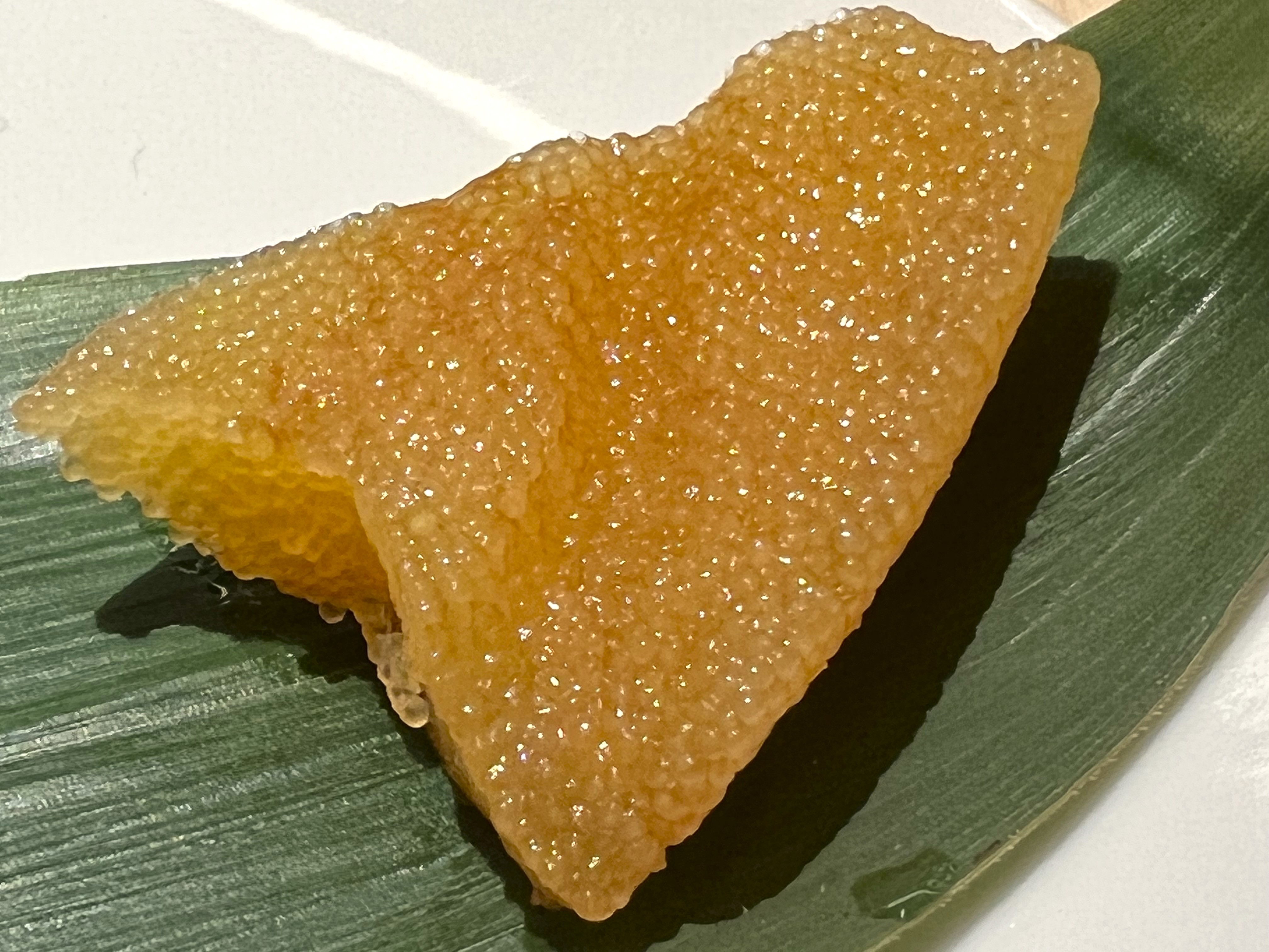 由日文直接音譯而來,雖然名稱難以對應取材與外形,但分別來自魚皮與下方魚卵的藍、黃兩色強烈對比,加上入口後伴隨脆彈的明顯酸香,總能讓人留下深刻印象;更何況妝點於散壽司或沙拉中的顆粒,一如寶石般耀眼。