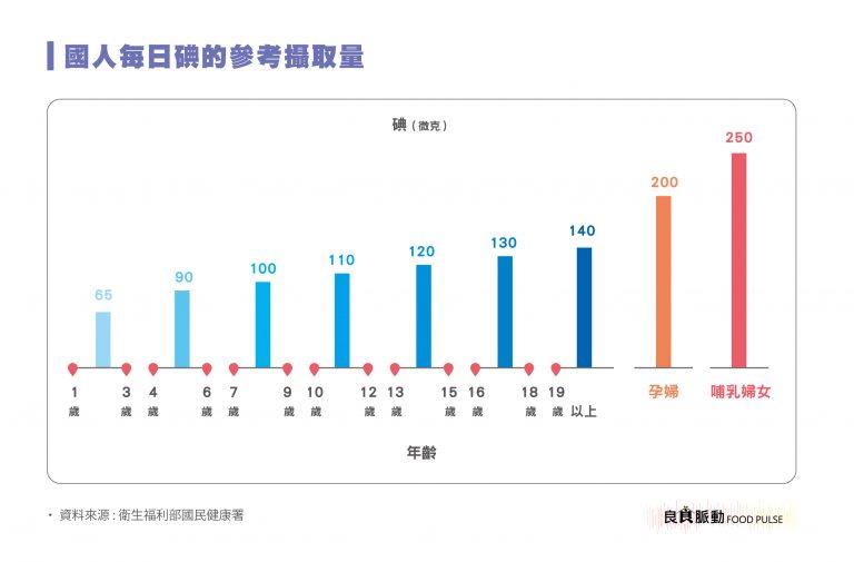 除了鈉,和食鹽相關的營養素還有碘。碘是人體必須攝取的微量元素,科學研究已證實,缺乏碘可能引發甲狀腺腫大、代謝異常、嬰幼兒發育遲緩和腦發育受限、孕婦流產和胎兒畸型等健康風險。依據衛生福利部國民健康署公布的第七版「國人膳食營養素參考攝取量」,國人每日碘的參考攝取量如下表,由於含碘的食物種類較有限,一旦未特別留意很容易攝取不足。