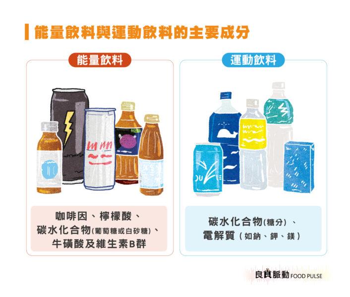 運動飲料主要成分是碳水化合物(糖份)及電解質,能補充血糖,增加運動時肌耐力持久性,電解質如鈉、鉀、鎂,能補充流汗失去的鹽分,維持血液的電解值,讓肌肉正常運作,防止抽筋,一般建議在激烈運動後才飲用,若僅有30分鐘的正常運動,喝水即可。另外,含咖啡因較高的能量飲品,在運動中間或結束後,較不建議飲用,因為能量飲料中大量的咖啡因有利尿功能,使得人體在運動時會脫水,減慢身體恢復。