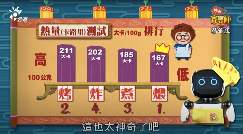 同樣100g的食材,用「烤、炸、煮、煨」四種烹飪方式來測試,熱量由低到高為煨>烤>煮>炸。(圖片來源:公視節目《神廚賽恩師》截圖)