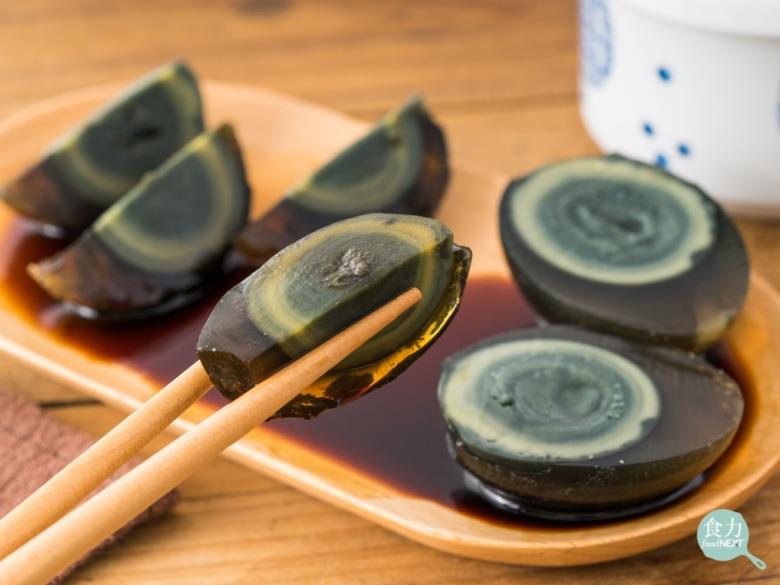 氫氧根離子藉由滲透作用後,與鹼性物質進行化學作用,讓蛋白質變性凝結為膠凍狀,皮蛋的口感就是這樣來的。(圖片來源:公視節目《神廚賽恩師》截圖)