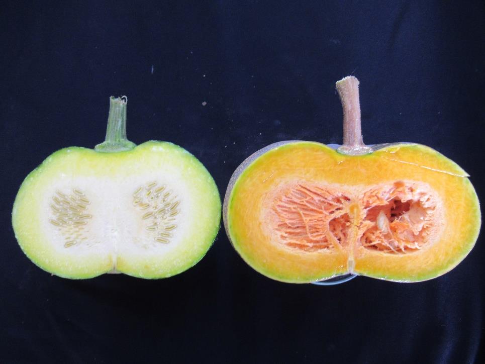 木瓜形南瓜未成熟果(左)與完熟果(右)剖面圖。(圖片來源:農業部提供)