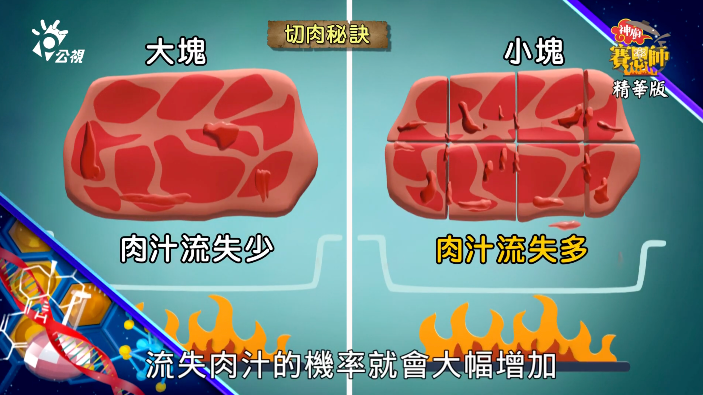 「燒」肉時也要注意!切小塊肉汁流失多,切大塊反而能鎖住肉汁。(圖片來源:公視節目《神廚賽恩師》截圖)