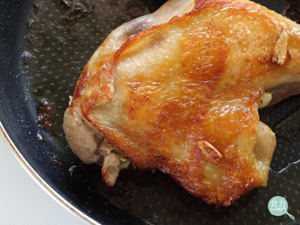 煎雞腿排時不加蓋,外表會先煎熟,反而能夠鎖住水分。(圖片來源:公視節目《神廚賽恩師》截圖)