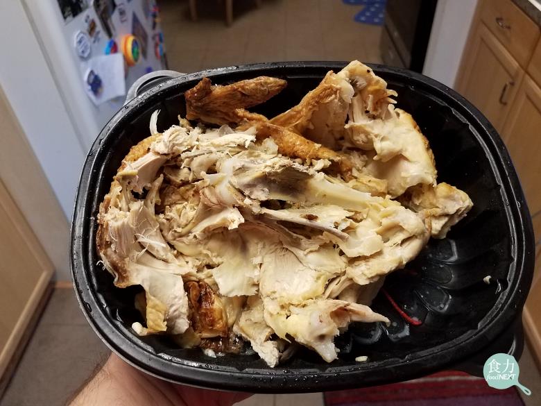 撕成雞絲以後,大火熱油爆炒,或是以微波爐高溫復熱,油騷味放大一些,還是在可以品嚐的範圍內。但是高溫復熱只能少量為之,否則分量一多,油鍋熱度或微波熱度上不去,最終還是變成慢速加熱,出現難聞油騷味。