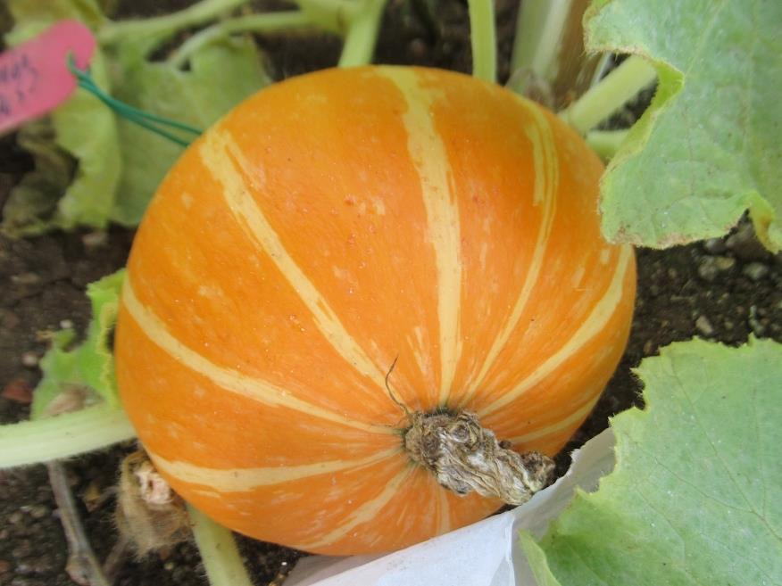 這是成熟的中國南瓜(扁球型),直接由肉眼觀察顏色的變化,表皮的白色蠟粉變成黃褐色時,也是其中一種採收評估的方法。(圖片來源:高雄農改場提供)