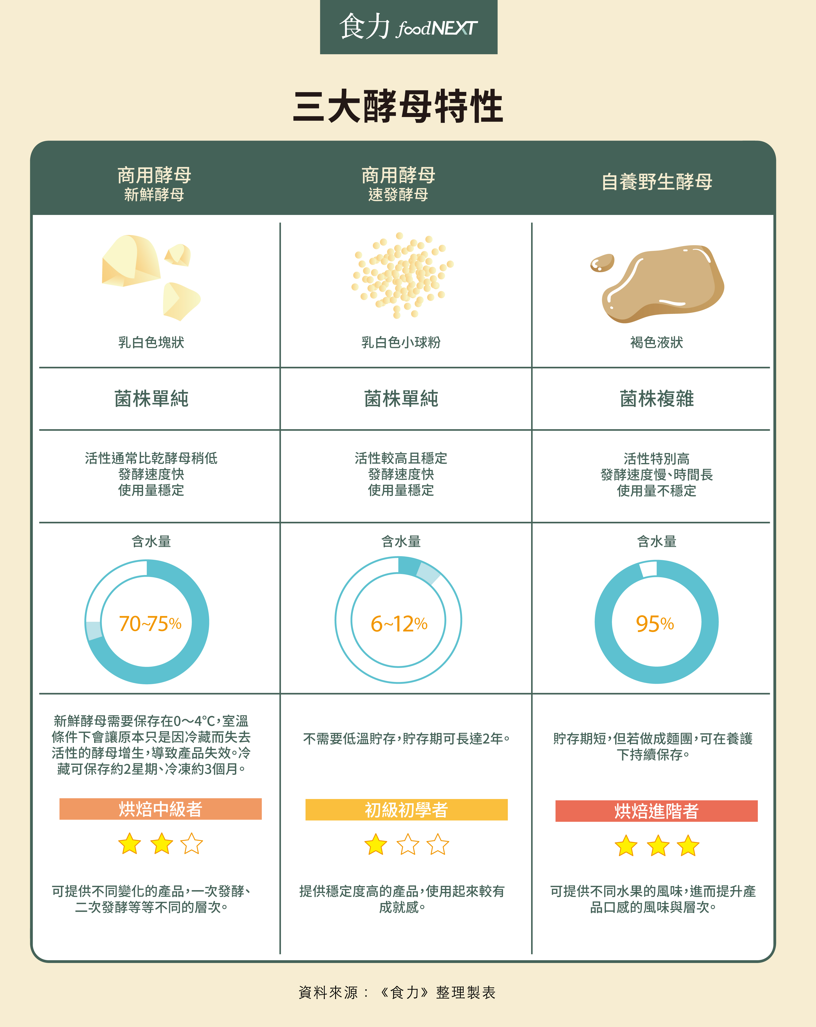 然而,世界上之所以會出現商用酵母也不是沒有原因,商用酵母可經廠商挑選出適合麵包製作的菌種,意指選用出芽增殖速度較為適中的優勢菌種,剔除容易在短時間內大量生長進而導致養分不足而死亡,或是生長速度較慢而發酵力不足等弱勢菌種,由於菌種種類單純而平均,讓烘焙初學者更能夠掌控變因,在製作過程中提高穩定性以及發酵成功的機率。