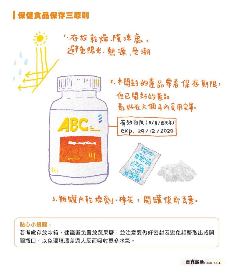 一般的保健食品都是食品,不是藥品,並不能取代正規醫療。保健食品一旦開封,最好依其建議食用量盡可能在3~6個月內吃完,不建議看包裝上的有效日期還沒到,就慢慢吃、想到才吃。