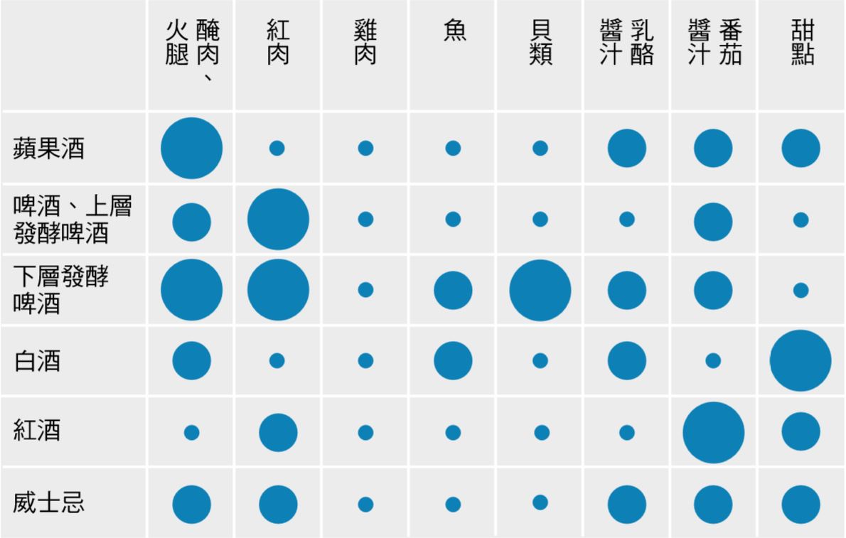 各種酒精與不同食物在烹調上的搭配合適度,圈圈越大表示相配度越高。(圖片來源:楓葉社文化提供)