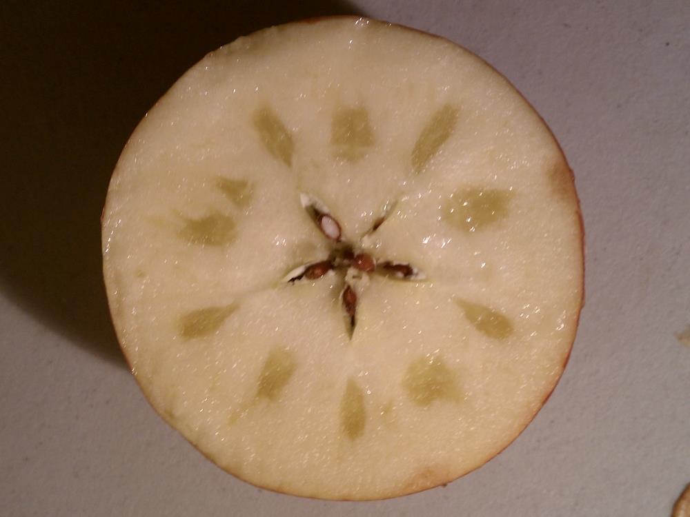 出現水心症的蘋果,成因可能與溫度、施肥情況、氣候等多重因素導致,使得蘋果果核周圍的維管束呈現半透明狀。而可能的原因有: