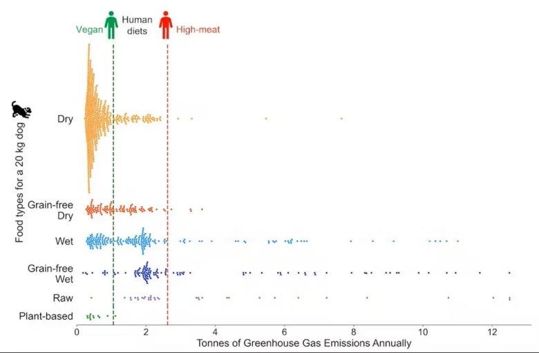研究發現,狗食的碳足跡相差懸殊,可相差65倍之多。生的、富含肉汁的濕糧或罐頭、含肉量高的狗食碳足跡較高;乾糧、蔬食(plant-based)、未標榜無穀物的狗食對環境影響較小。