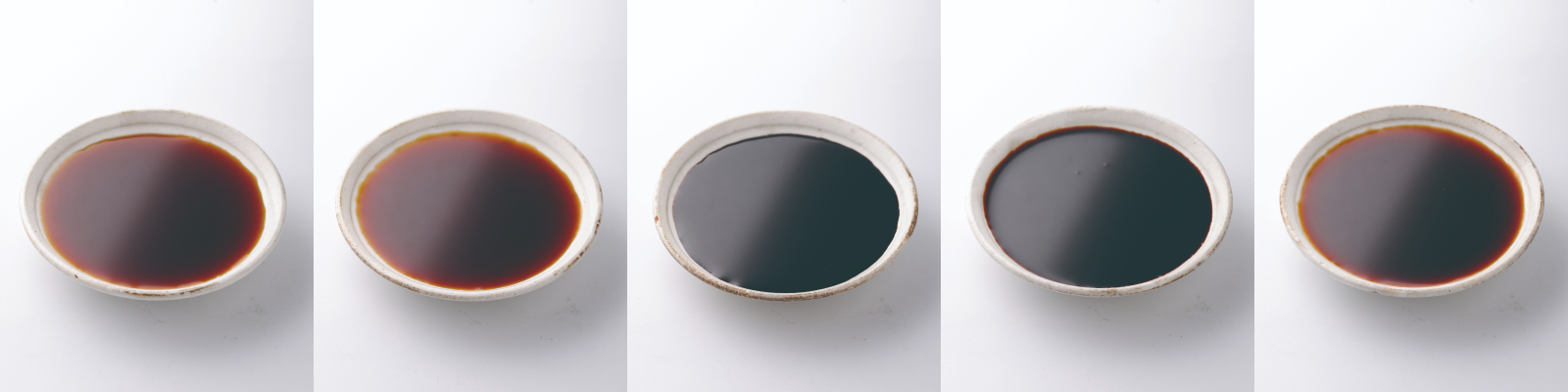 左到右分別是淡口、淡口、濃口醬油、再發酵醬油、溜醬油。(圖片來源:城邦文化提供)