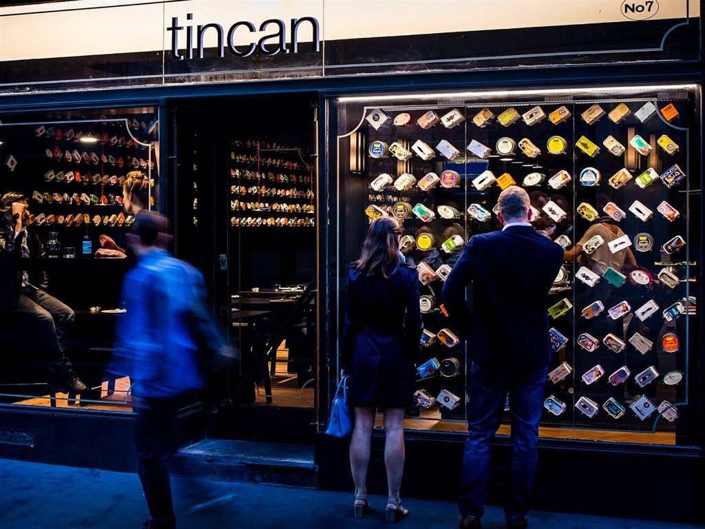 這股「罐頭食品+餐飲」的風潮,也吹往歐美國家,像是英國倫敦就出現了罐頭食品餐廳Tincan,把罐頭食品各式各樣形狀融入餐廳設計中,善用罐頭本身的金屬感,營造出摩登工業風的用餐氛圍。