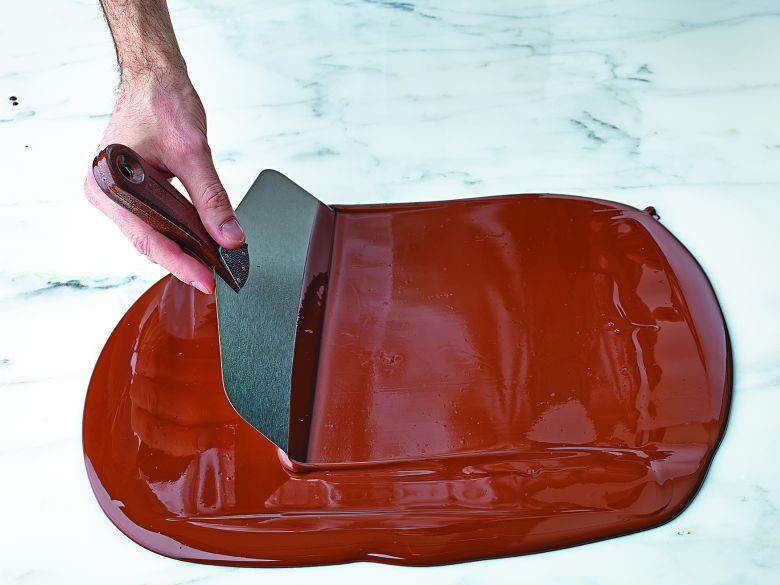 3. 把百分之八十的融化巧克力倒在工作枱上。用兩把刮刀慢慢變換巧克力的位置,攪動巧克力。一邊作業,一邊用兩把刮刀互相刮乾淨刀上的巧克力。