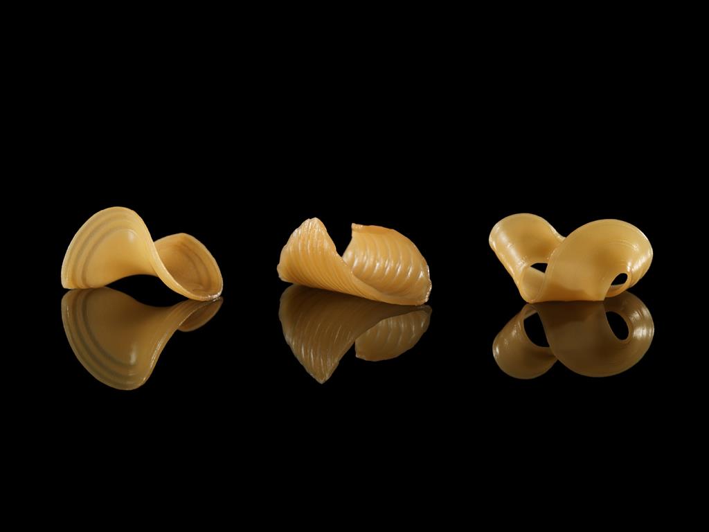 管狀、貝殼狀的義大利麵,在包裝中蓬鬆佔空間,無論是運送或是排列在貨架上都十分佔空間,但各種立體形狀帶給人們的視覺與口感享受很重要,麻省理工學院(MIT)的Tangible Media Group團隊,想出讓立體食物先變成2D降低運輸成本與儲存空間,但只要加水烹調就馬上恢復成3D造型,而且還可根據想像設計出更多變的立體造型。