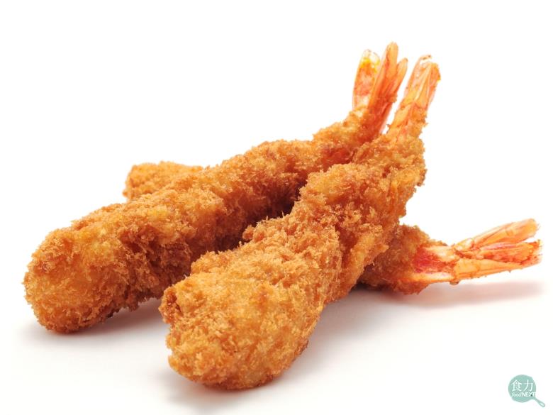 如果想炸出多汁的蝦子,不讓美味外流,重點就在於麵衣讓蝦子的肌肉不容易收縮。為此,將蝦肉沾滿麵粉、蛋液,最後包裹麵包粉的時候用手輕輕握住蝦子,讓麵包粉確實附著在蝦子上。