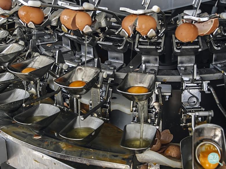 再回到自動化打蛋的產線上,一經破殼,雞蛋的內容物往「蛋杯」一掉,蛋杯第一層會最先會接住蛋黃,第一層乘載不住的蛋白便會如沙漏一般,往第二層前進,這個擁有二層結構的蛋杯就是分離蛋黃、蛋白的秘密武器啦。