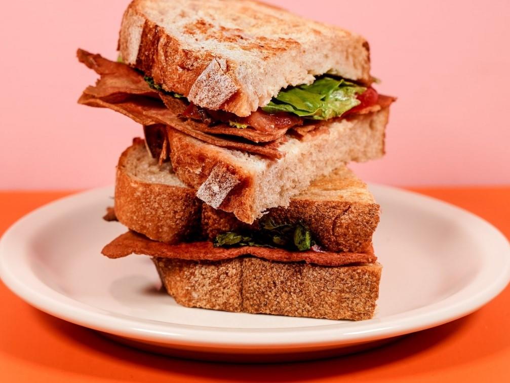 Le補充:「成品是包含植物性脂肪與調味的塊狀物,過程中以煙燻使其成色、增添風味,最後再以機器將成品切片,真菌培根就這麼登場了,製作工法跟一般葷培根相同。」