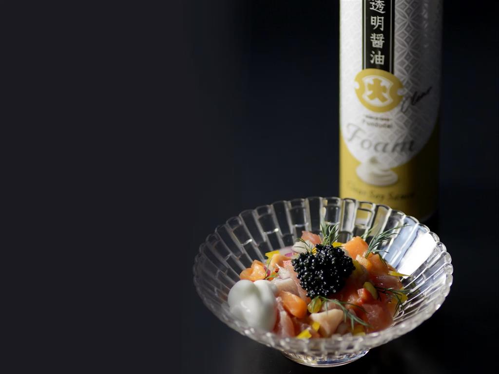 1、泡沫透明醬油Foam-Clear Soy Sauce:以人氣商品「透明醬油」為基礎,展現食材原色與鮮味。