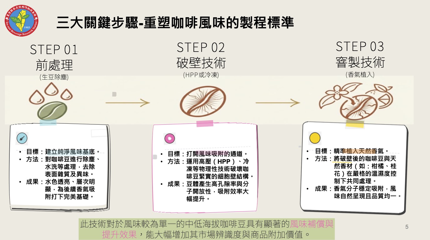 茶改場指出,與其持續以「挑戰風土限制」作為產業論述,不如正視結構差異,透過系統化加工與風味工程技術,重新建構咖啡的感官表現,這正是「天然香氣植入技術」的研發出發點。