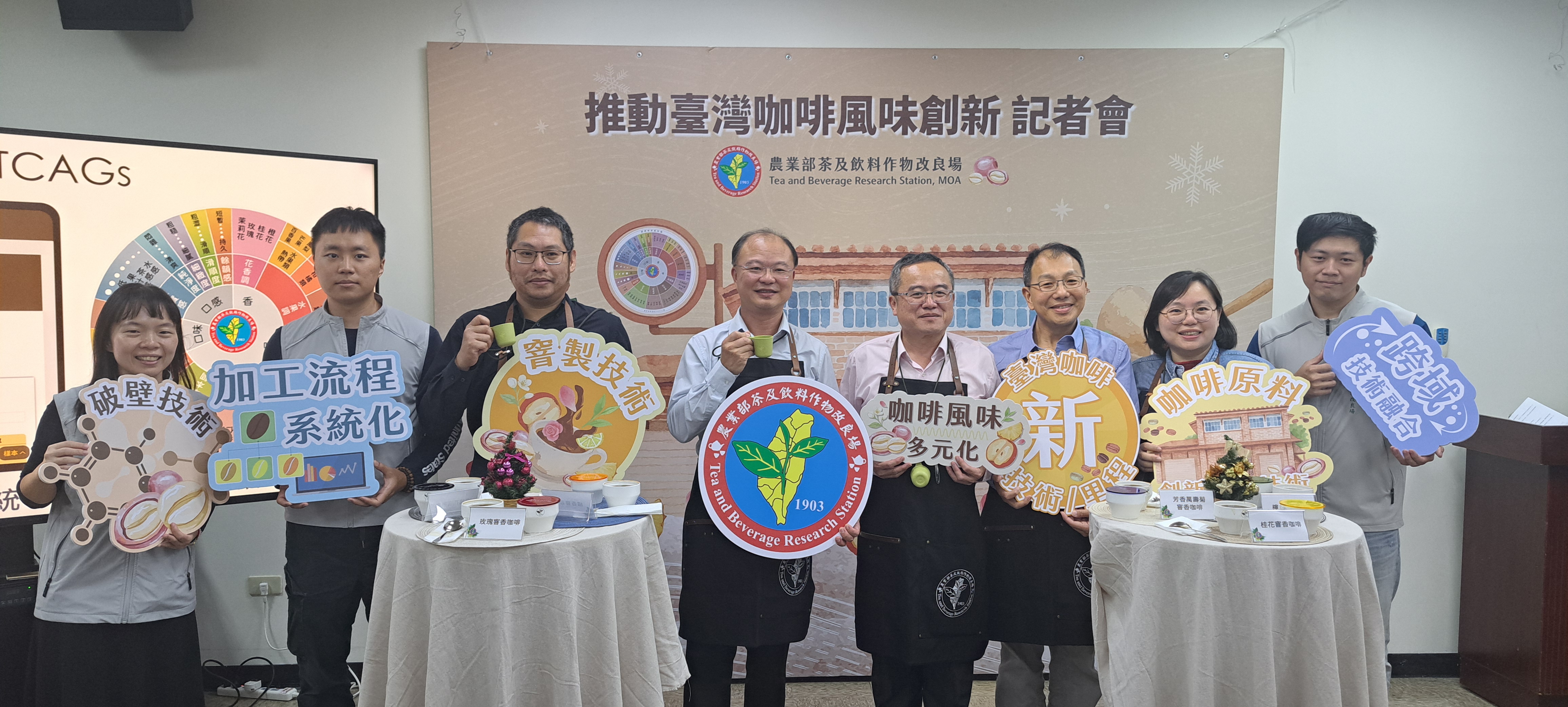 蘇宗振場長(左四)率領茶改場研發團隊共同發表「咖啡香氣窨製技術」。(圖片來源:茶改場提供)