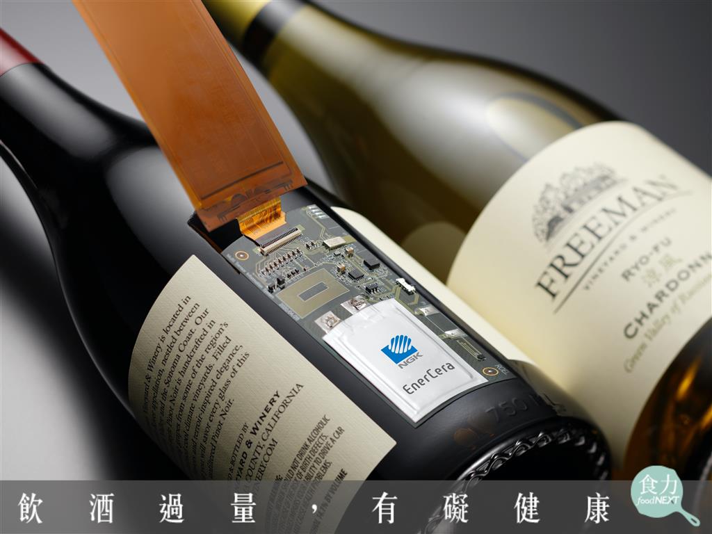 NGK Insulators所開發的溫濕度傳感器的電池EnerCera僅有0.45毫米,克服厚度問題如標籤紙般容易貼合在酒瓶上。(圖片來源:NGK Insulators官網)