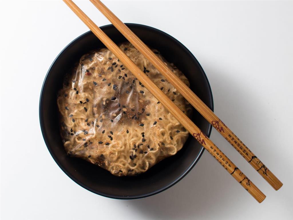 由馬鈴薯澱粉、甘油和少數的水製成的泡麵包裝可連同麵體直接沖食,還能將調味料和乾燥蔬菜片一起包裹。(圖片來源:Holly Grounds官網)