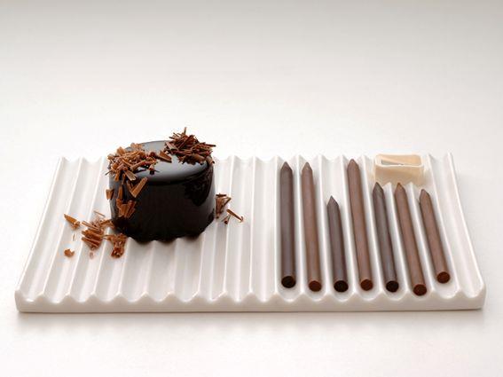 你是否曾經吃過或看過傳統巧克力蛋糕上,1片片微微捲曲狀的巧克力屑,那會讓你想到什麼?Nendo聯想到的是小時候削鉛筆機削出來的鉛筆屑!2007年,Nendo和頂級巧克力品牌Le Chocolat de H. Tsujiguchi合作的鉛筆巧克力,濃度不同的巧克力被製作成顏色不一的鉛筆造形,每隻筆用巧克力的濃度(70%、80%、90%)隱喻鉛筆的筆芯顏色深淺(2B、3B、4B),而鉛筆盤形狀的蛋糕盤凹槽放置「削筆刀」,藉此喚醒消費者的共鳴和記憶,你可以回味學生時代邊削鉛筆邊留下鉛筆屑的體驗,只是這次鉛筆屑不會被撥到垃圾桶,而是進到你的肚子裡。