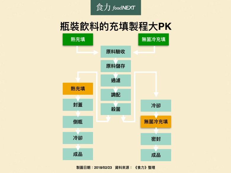 目前食品業界填充飲料的方式主要可分為2種:一種是熱充填,另一種是無菌冷充填。