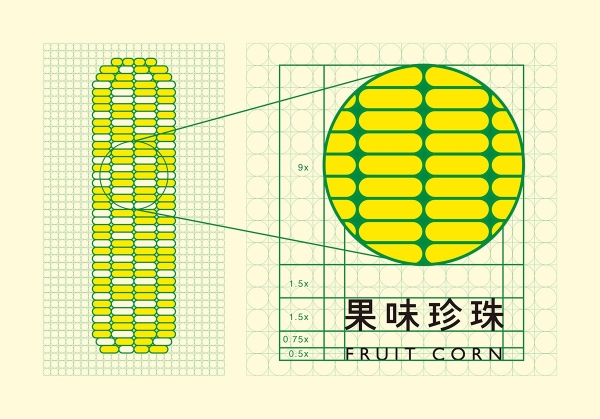 果味珍珠就如其名,帶有水果味,是為一個新品種的高品質玉米打造的品牌,玉米經嚴格挑選及各種品質檢測後真空包裝,銷往中國。雖是銷往國外,但設計師依舊將生產過程以細膩俐落的風格繪成小圖示,並搭配簡短的文字,傳遞出玉米的品質保證,讓消費者可以吃得安心,同時藉由可愛的圖示拉近品牌與消費者之間的距離。