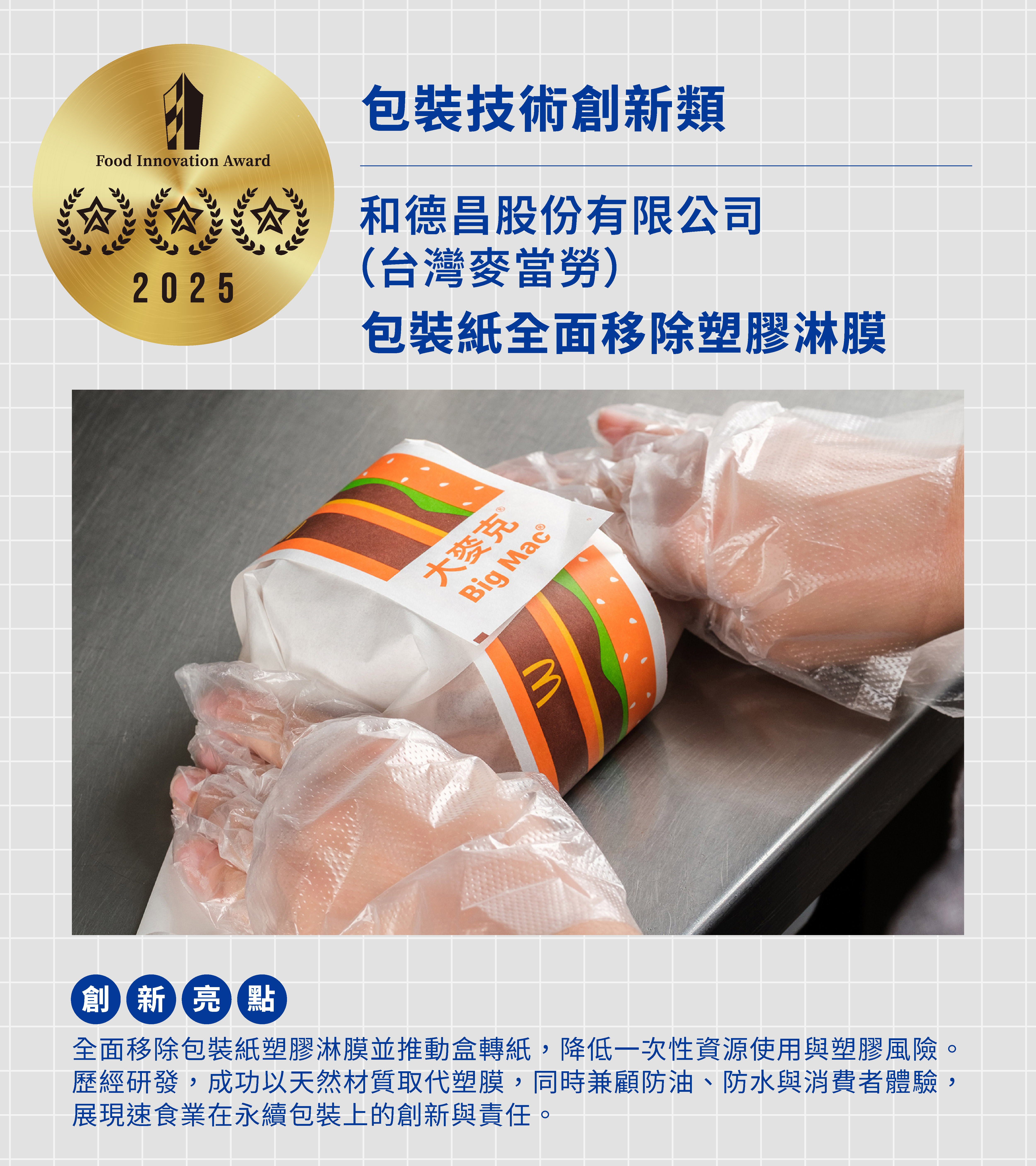 本屆獲得三星肯定的台灣麥當勞,全面移除食品包裝紙內層的塑膠淋膜,改以天然澱粉材質或矽材質取代,為極大的突破與革新。由於許多傳統塑膠淋膜材質,在高溫下可能釋出微塑膠或塑化劑,不僅難以回收,也對人體與環境造成潛在風險,食創奬評審、呈曜包裝事業有限公司總經理許呈湧說,「去除塑膠淋膜,這對外帶食物來說,在食品業上是一個很大的創舉,從源頭降低健康風險。」