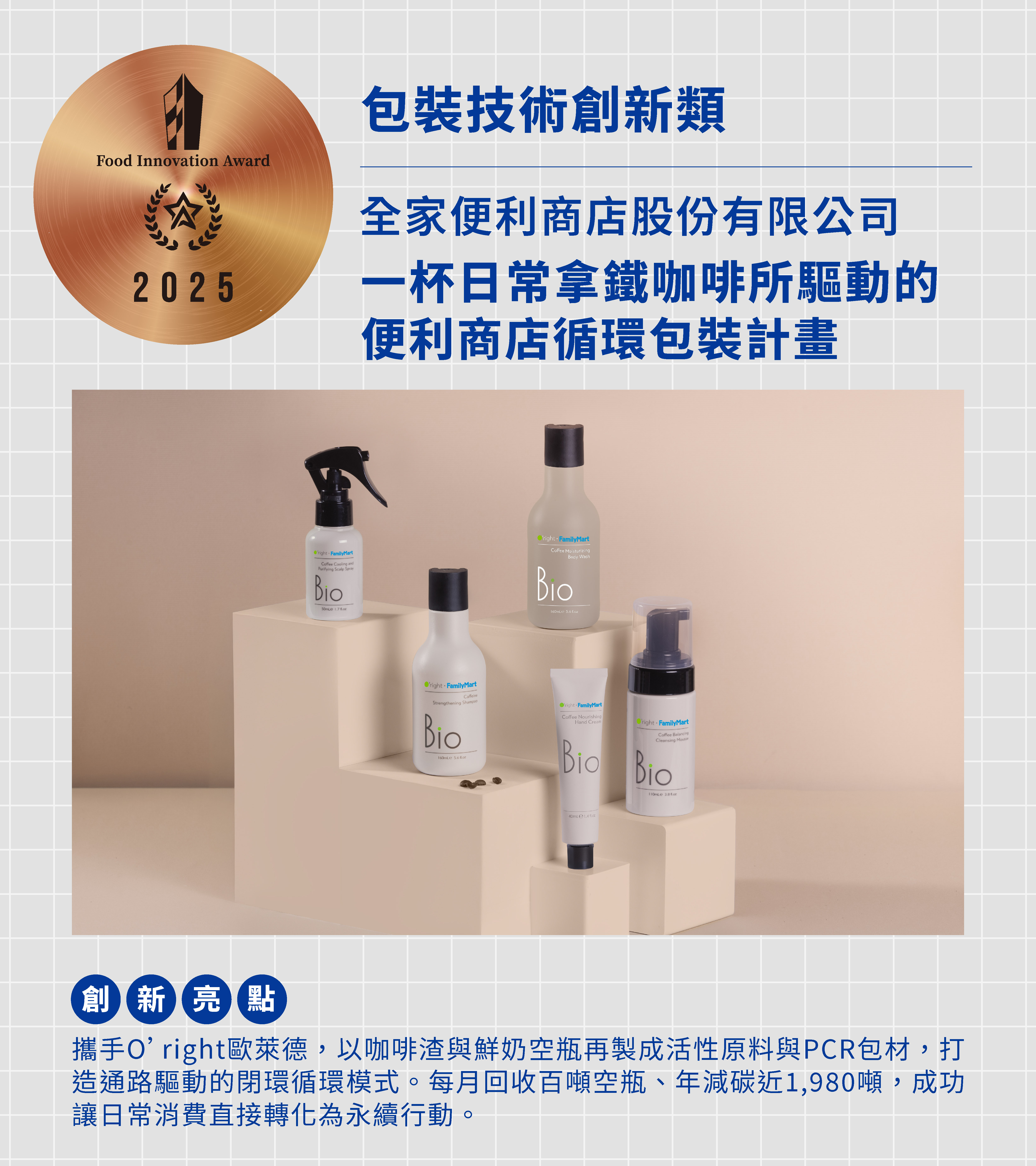 目前全球PET(Polyethylene terephthalate,聚乙烯對苯二甲酸酯),仍是回收率最高的塑膠,各國正積極探索再往上提高回收比例的可行性作法。全家便利商店攜手O’right歐萊德,推出全球首創的「Bio永續美妝系列」,鎖定兩類全家門市日常高頻廢棄物——Let’s Café咖啡渣與鮮奶空瓶,透過回收再製,取代一次性原生資源,獲得一星肯定。