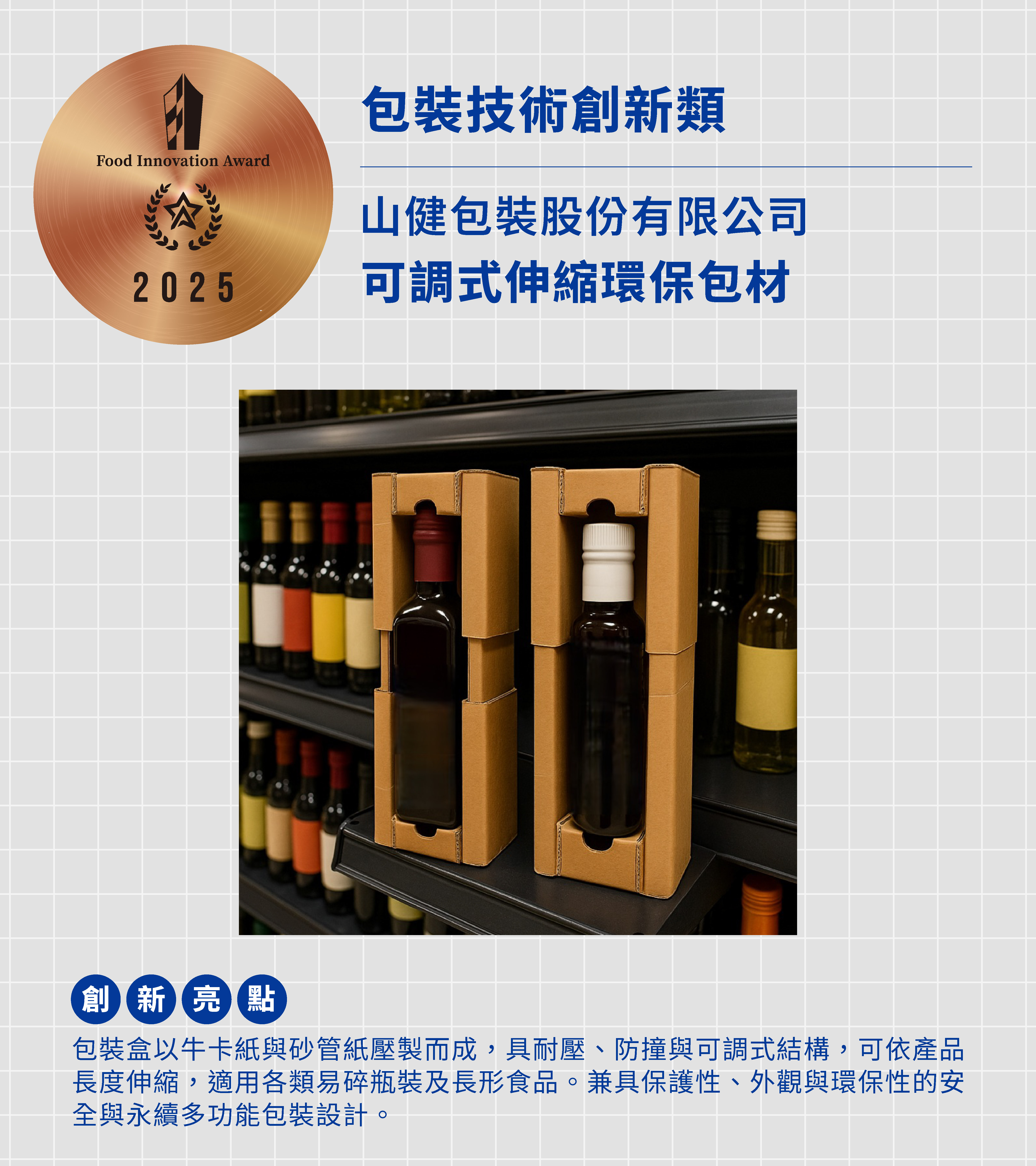 隨著消費者對健康與環境意識提升,食品包裝的永續化成為企業展現ESG的重要指標。從可回收、可生物分解的材質,到廢棄物再製成高價值產品,品牌不僅降低環境與健康風險,也創造循環經濟價值。2025年食創奬案例中,移除塑膠淋膜、回收咖啡渣與鮮奶瓶,再加上創新可伸縮包材設計,皆展現食品產業在包裝綠色升級上的實際行動與創新成果。